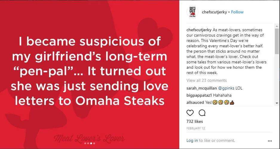 Included in some of those laughs are videos for our fake app, Tender, on National Jerky Day and a "Meat-Lover's Lover" campaign for Valentine's Day. In a category that's historically only hit on one hyper-masculine note in its advertising, our approach allowed us to appeal to a previously untapped segment of consumers.